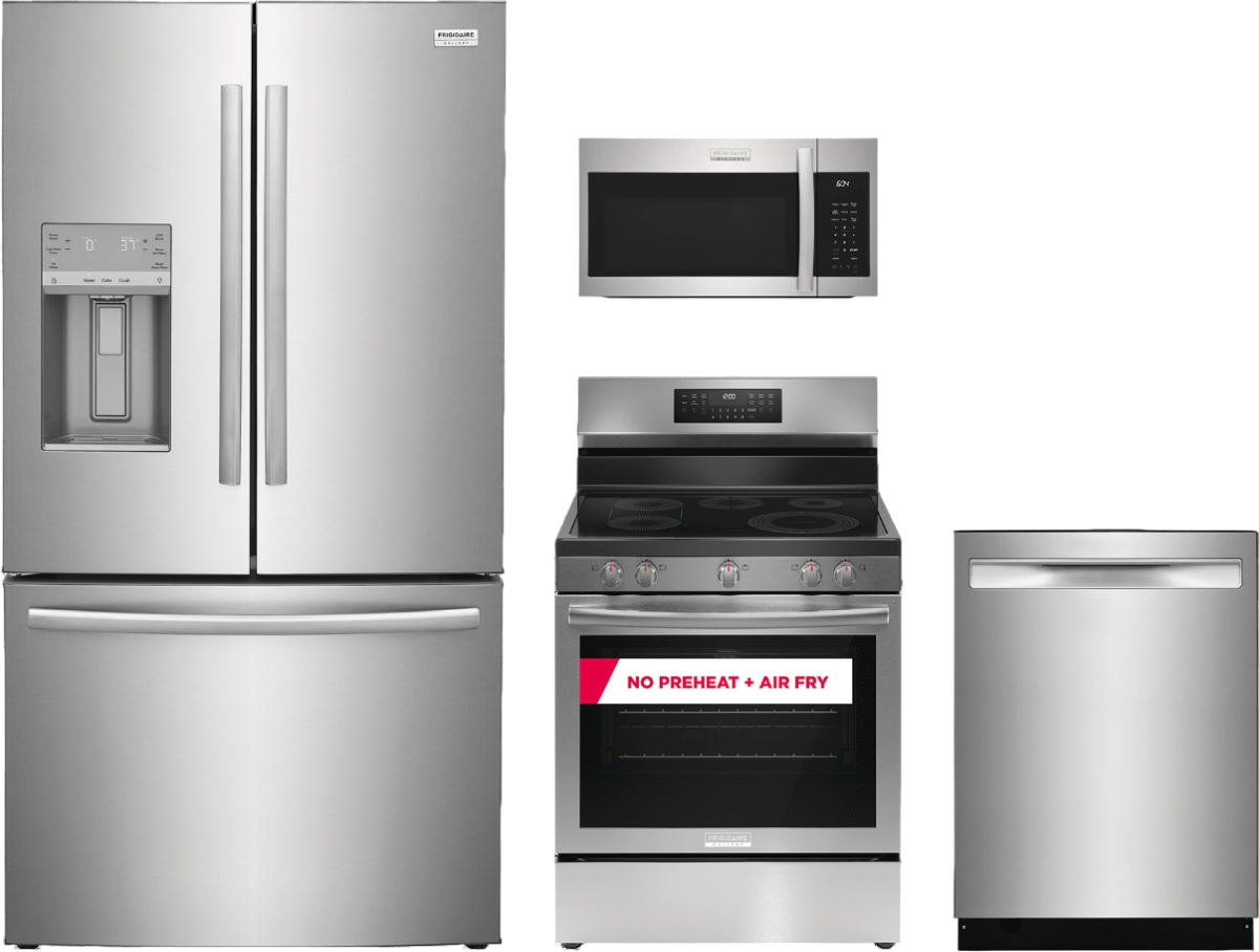 Frigidaire Gallery® 4 Piece Stainless Steel Kitchen Package with French door refrigerator, freestanding electric range, built-in dishwasher, and over the range Microwave.Read More