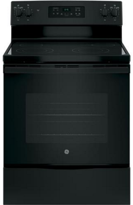 GE® 30" Black Free Standing Electric Range with 5.3 cu. ft. total capacity, self clean oven and ceramic glass cook topRead More