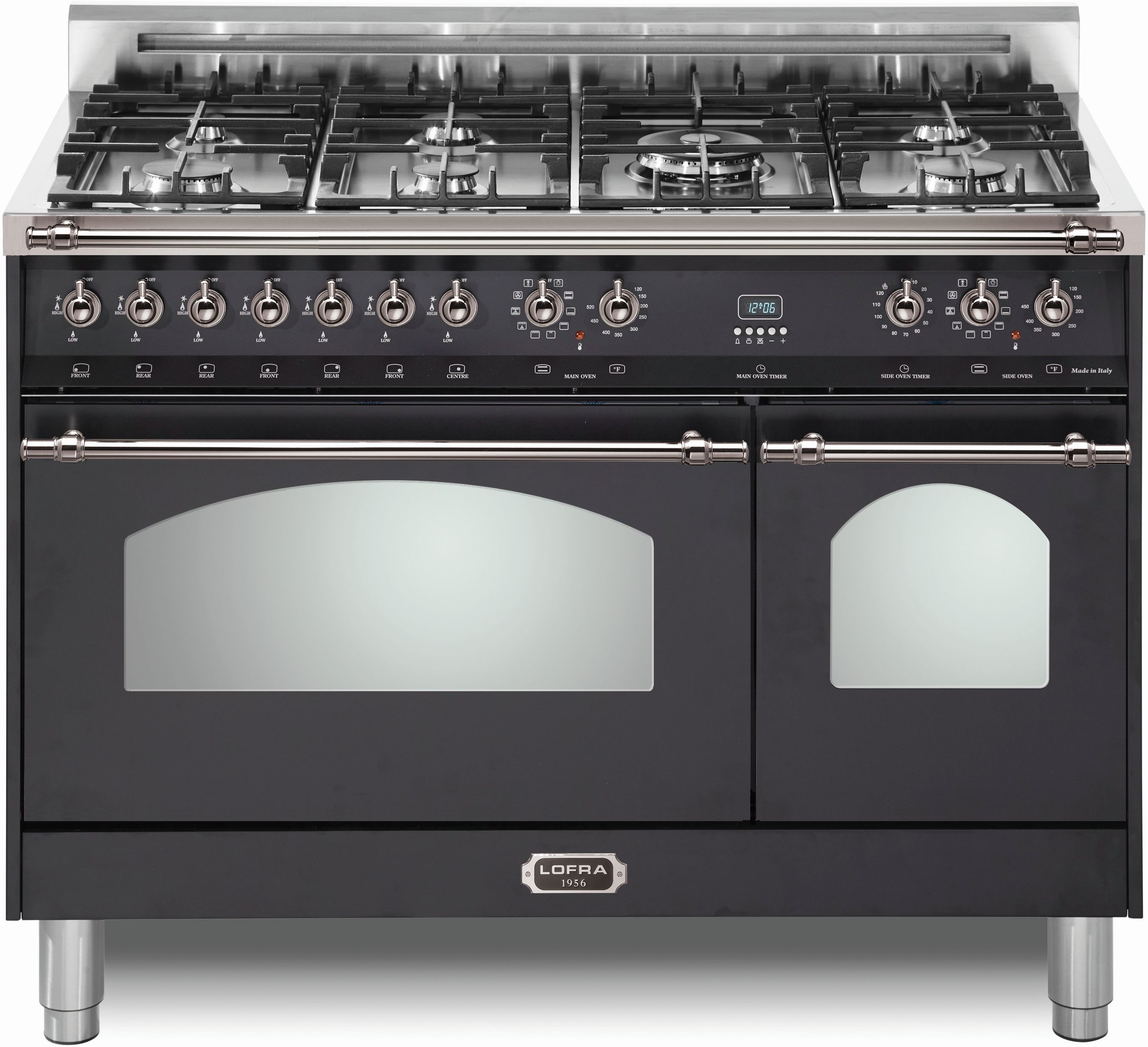 LOFRA® Dolcevita 48" Matte Black Pro Style Dual Fuel Range features 7 brass burners and matte black burner caps, ventilated doors with Cooling System, height adjustable stainless steel legs, and a large multifunction convection oven: 9 cooking modes.Read More