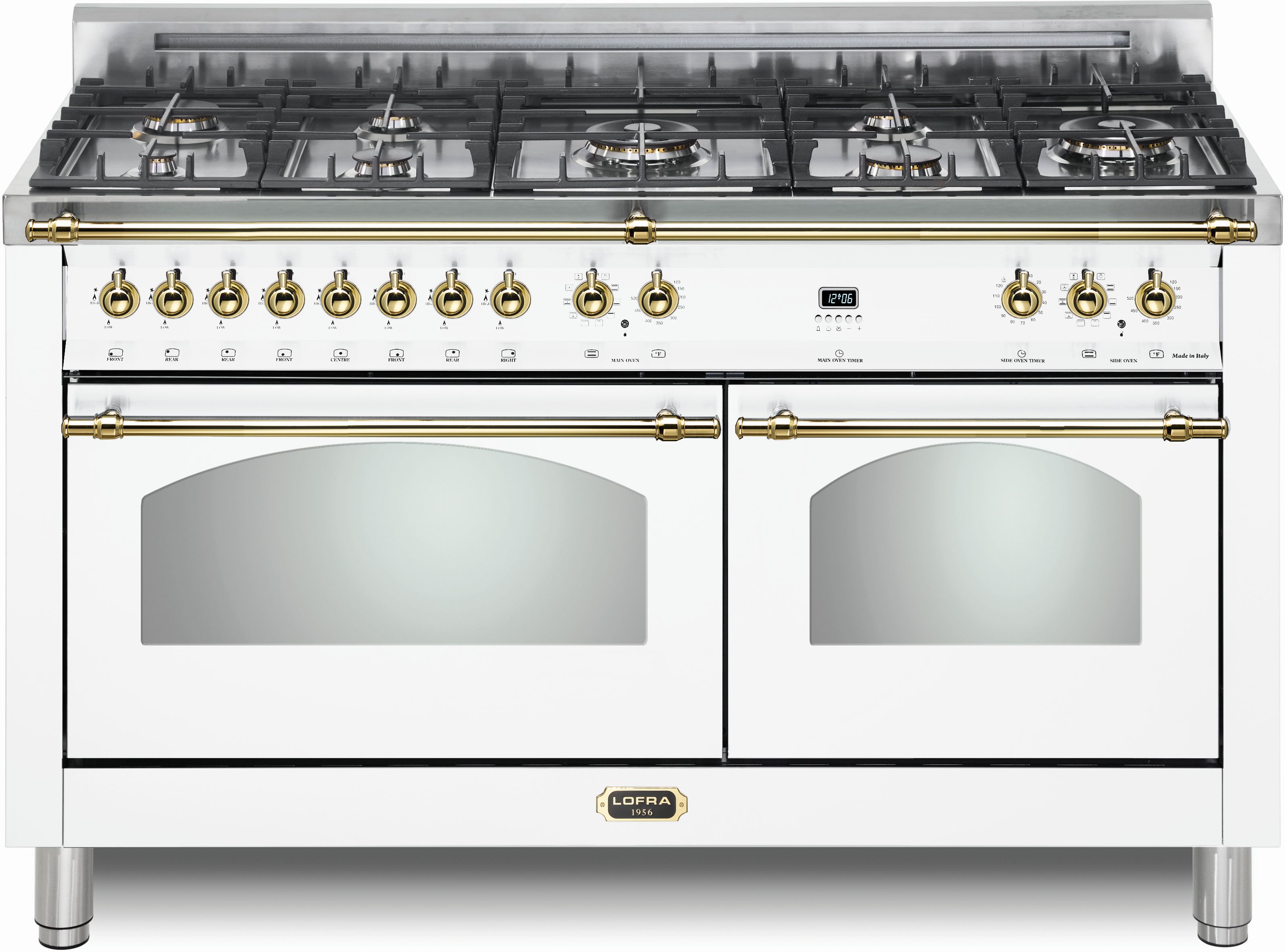 LOFRA® Dolcevita 60" White Pro Style Dual Fuel Range features 8 brass burners and matte black burner caps, ventilated doors with Cooling System Height adjustable stainless steel legs, and a large multifunction convection oven: 9 cooking modes.Read More