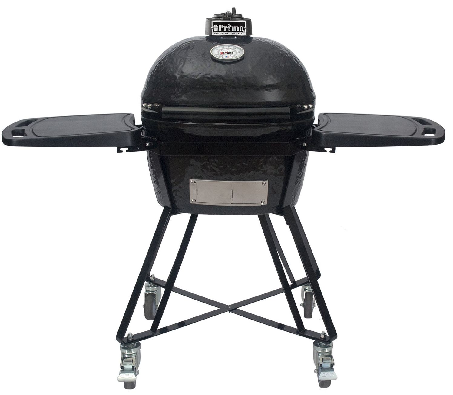 The Primo Oval JR 200 is deceptively large when it comes to cooking ability. In fact, two 14 lb. turkeys can be roasted simultaneously. Perfect as a primary grill or to complement your current gas grill. Features include a cast iron top vent, easy-to-read thermometer, reversible cooking grates, and a stainless steel draft door.