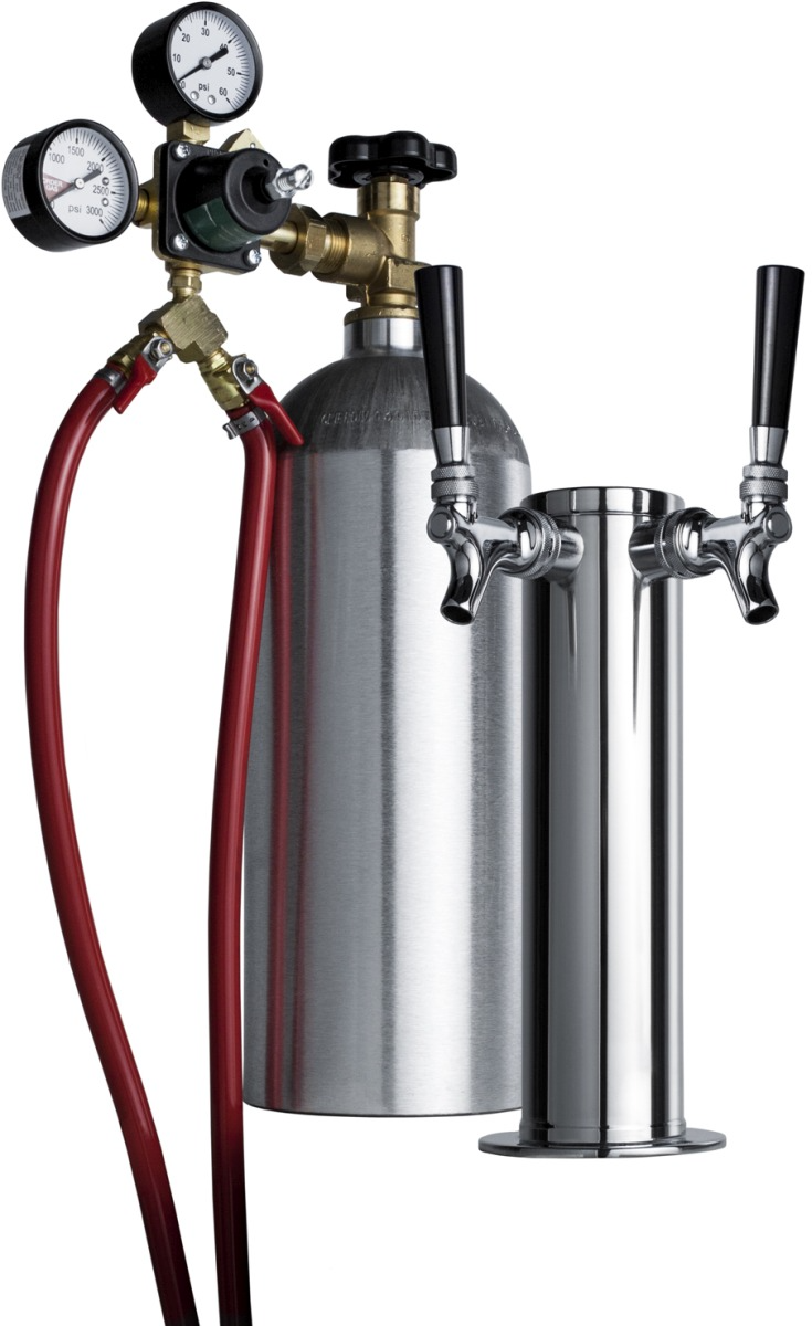 Twin tap draft tower, CO2 tank, regulator, and additional equipment to turn any kegerator into a cocktail dispenser
